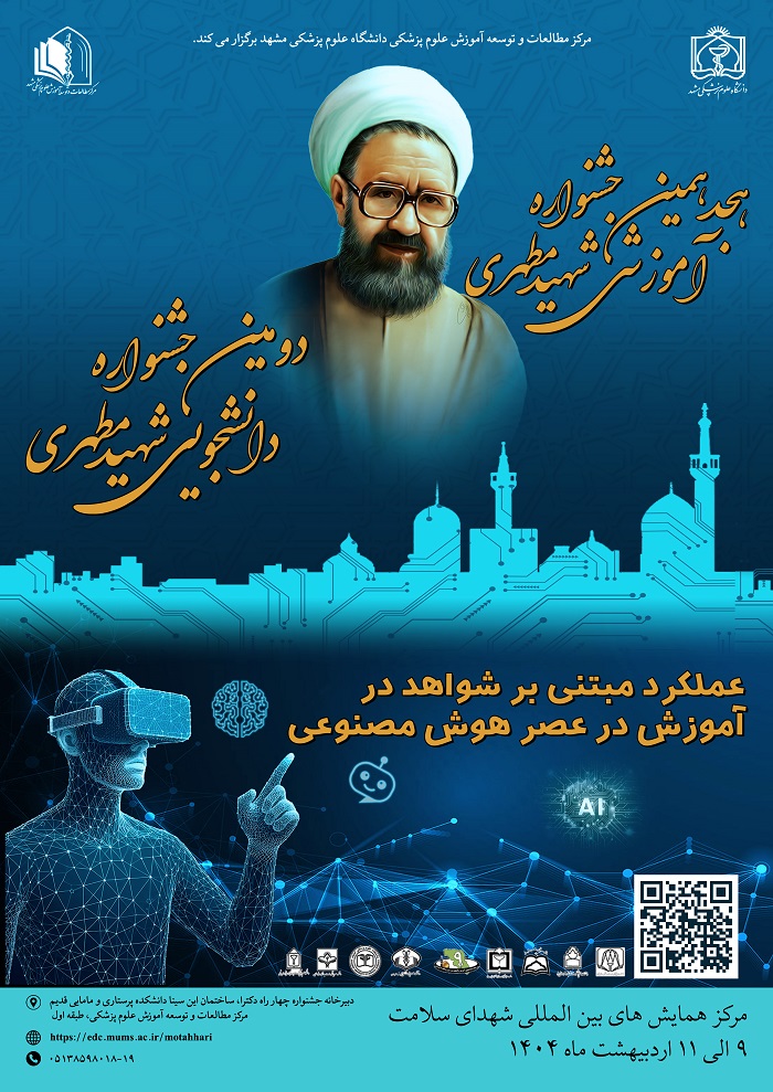 هجدهمین جشنواره آموزشی شهید مطهری با شعار “عملکرد مبتنی بر شواهد در آموزش در عصر هوش مصنوعی” طی روزهای 9 الی 11 اردیبهشت در مرکز بینالمللی همایشهای شهدای سلامت دانشگاه علوم پزشکی مشهد برگزار می شود.